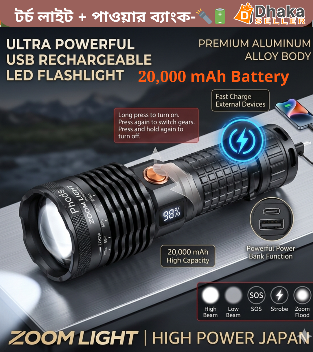 🔦🔋রাতের অন্ধকারে নিরাপদ চলাচল ও জরুরি কাজে নির্ভরযোগ্য একটি শক্তিশালী টর্চ হলো Zoom Light High Power Japan। এটি শুধু একটি সাধারণ টর্চ নয়, বরং শক্তিশালী আলো, দীর্ঘস্থায়ী ব্যাটারি এবং পাওয়ার ব্যাংক সুবিধাসহ একটি মাল্টি-ফাংশন ডিভাইস।
